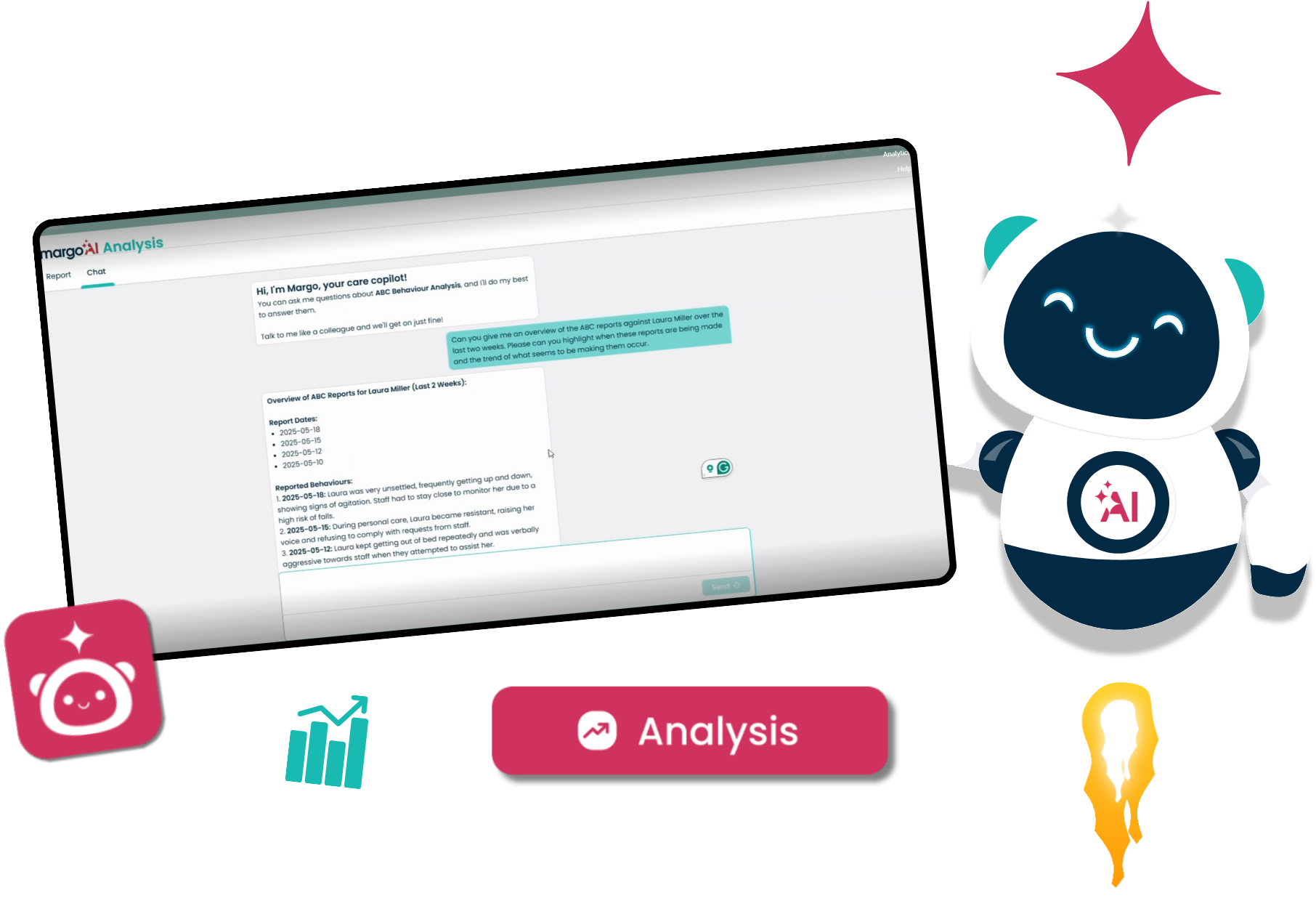 Get immediate trend reports and insights from your care data using AI-powered chat and graphs. MargoAI Analysis helps you identify risks, spot trends and make better decisions with zero delay. Quickly turn complex care records into simple reports you can use to drive improvements in real time.